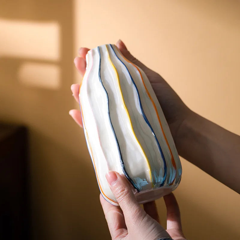 Crafted in ceramic with a colorful striped design, this vase adds a vibrant focal point to any room. Its modern silhouette makes it ideal for pampas grass, flowers, or as a standalone décor piece.